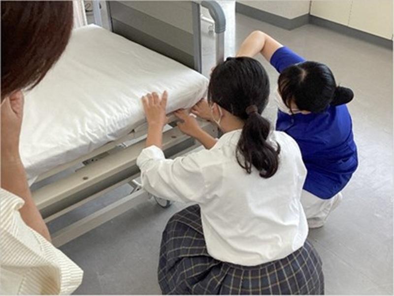 体験コーナーでは看護技術の基本であるベッドメイキングを 体験して頂きました。 在校生と一緒に看護学校での学びを体験です。