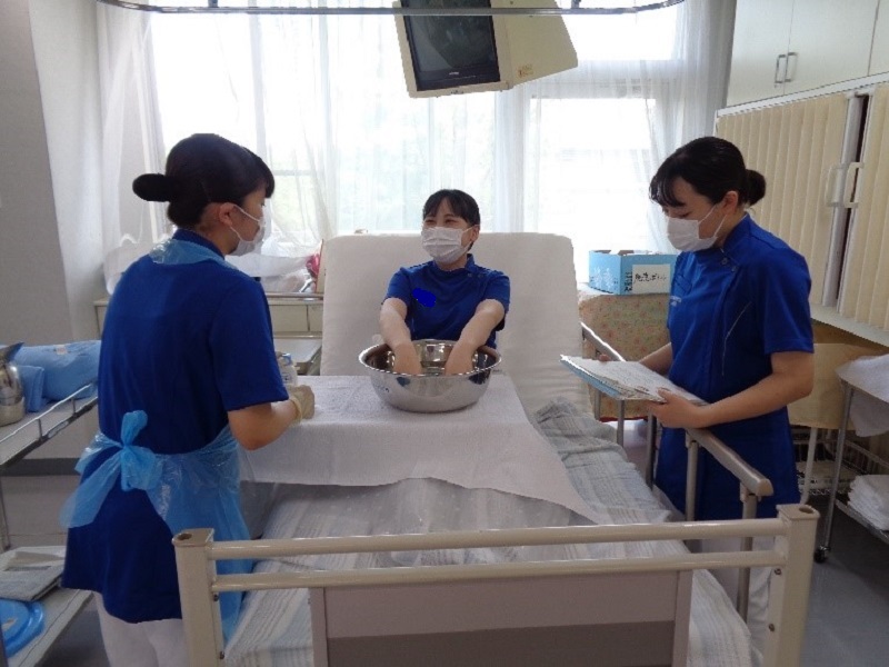 学生同士で手浴や足浴の練習を します。 「温まりましたか?気持ち悪いところは ありませんか?」 患者さんの、安全・安楽を考えながら 行います。